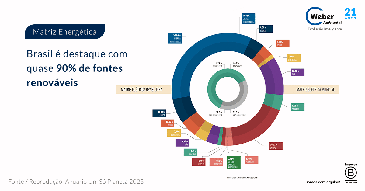 Segundo dados recentes, publicado no Anuário Um Só Planeta 2025*, a matriz elétrica brasileira atingiu cerca de 87,7% de participação proveniente de fontes renováveis (verifique o gráfico nas páginas 20 e 21 do Anuário).